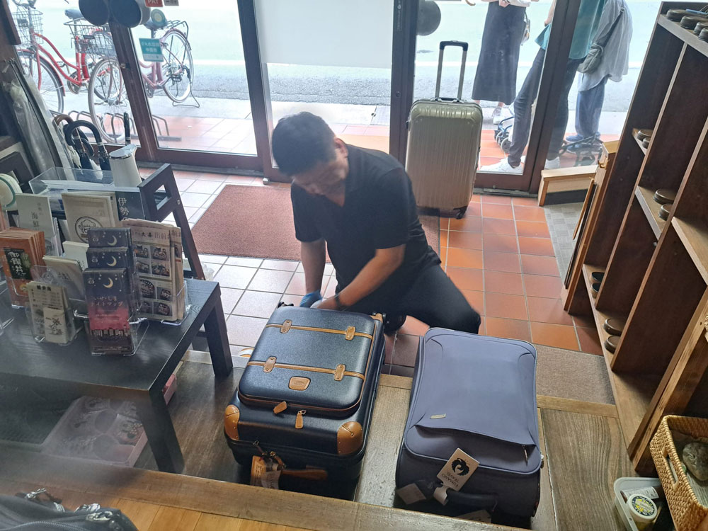 Arrivare a Ise, entrare nel piccolo ryokan e venire stoppati di corsa e con agitazione dal proprietario che ci fa togliere le scarpe (questo è normale); ci fa segno immediatamente di indossare le ciabatte da interno e blocca subito i nostri trolley. Molto, molto agitato.