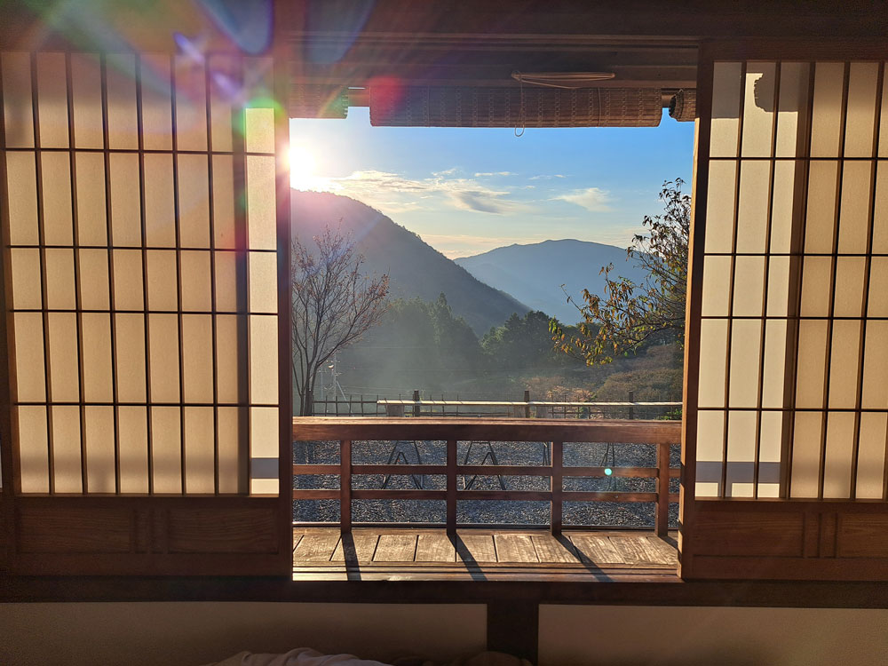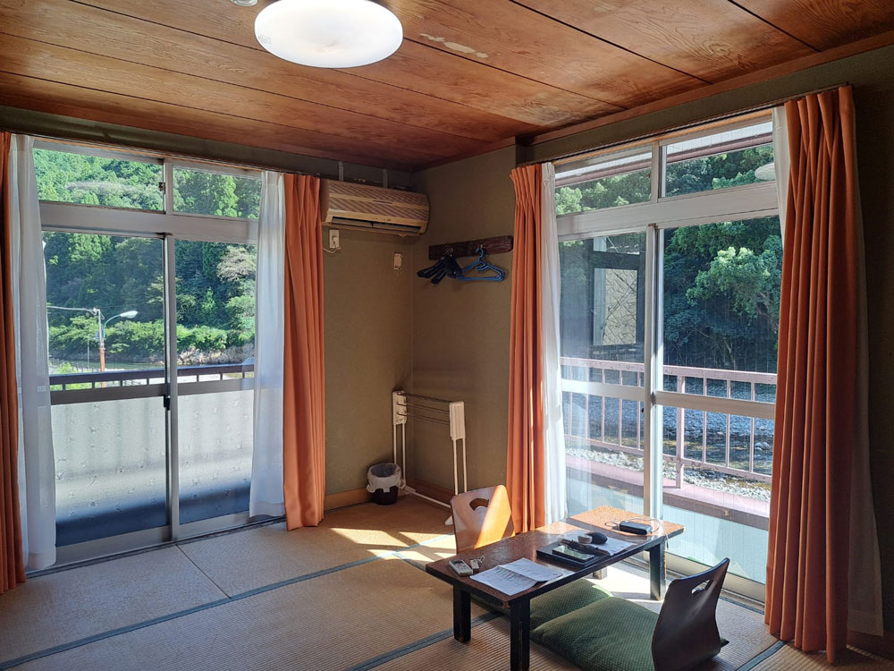 Arrivare in un piccolo e curato minshuku nel cuore del Kumano Kodo, sistemarmi in una bellissima stanza dalle cui finestre la vista spaziava su panorami montani e sul fiume.